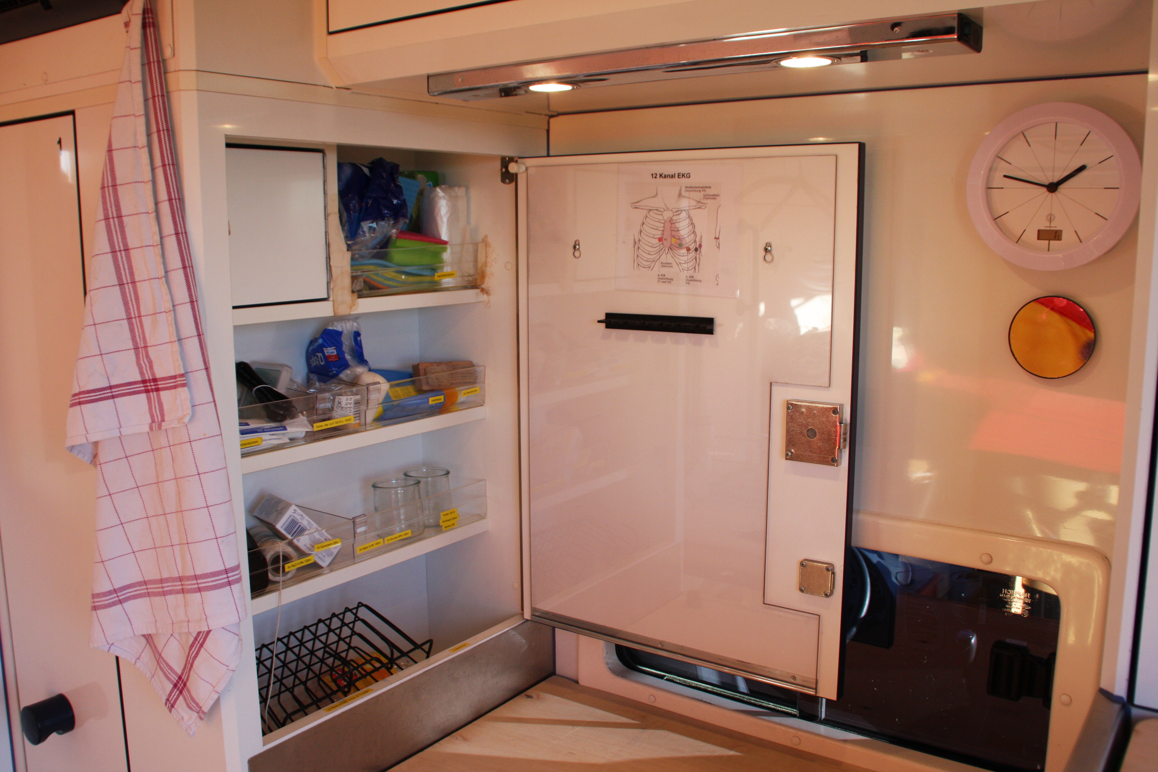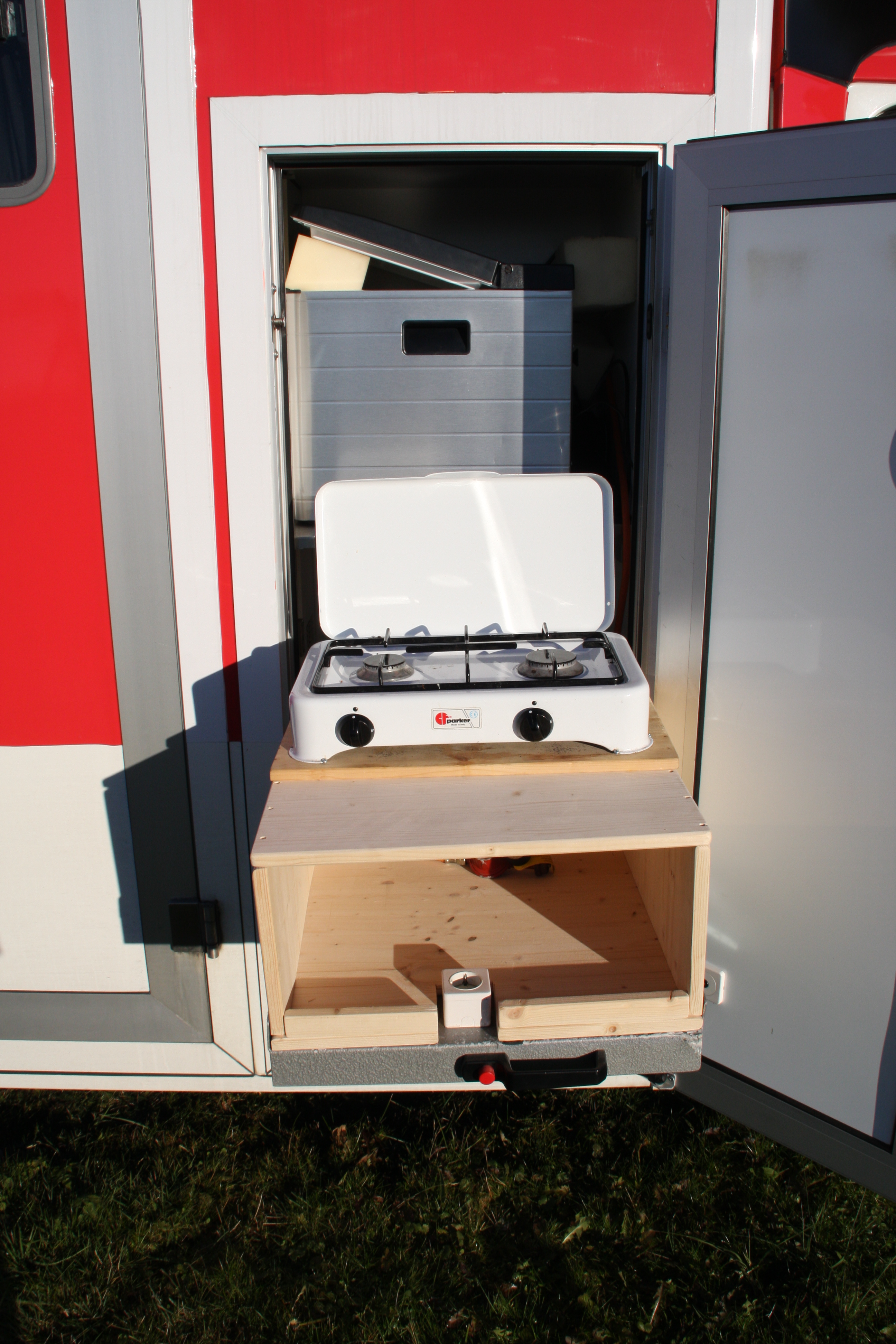 Ein Kühlschrank, der sowohl elektrisch als auch mit Gas betrieben werden kann, ist vorhanden. Gekocht wird elektrisch oder mit einem zweiflammigen Gasherd, der in einer ausziehbaren Schublade untergebracht ist. Ideal für warme und kühle Tage.