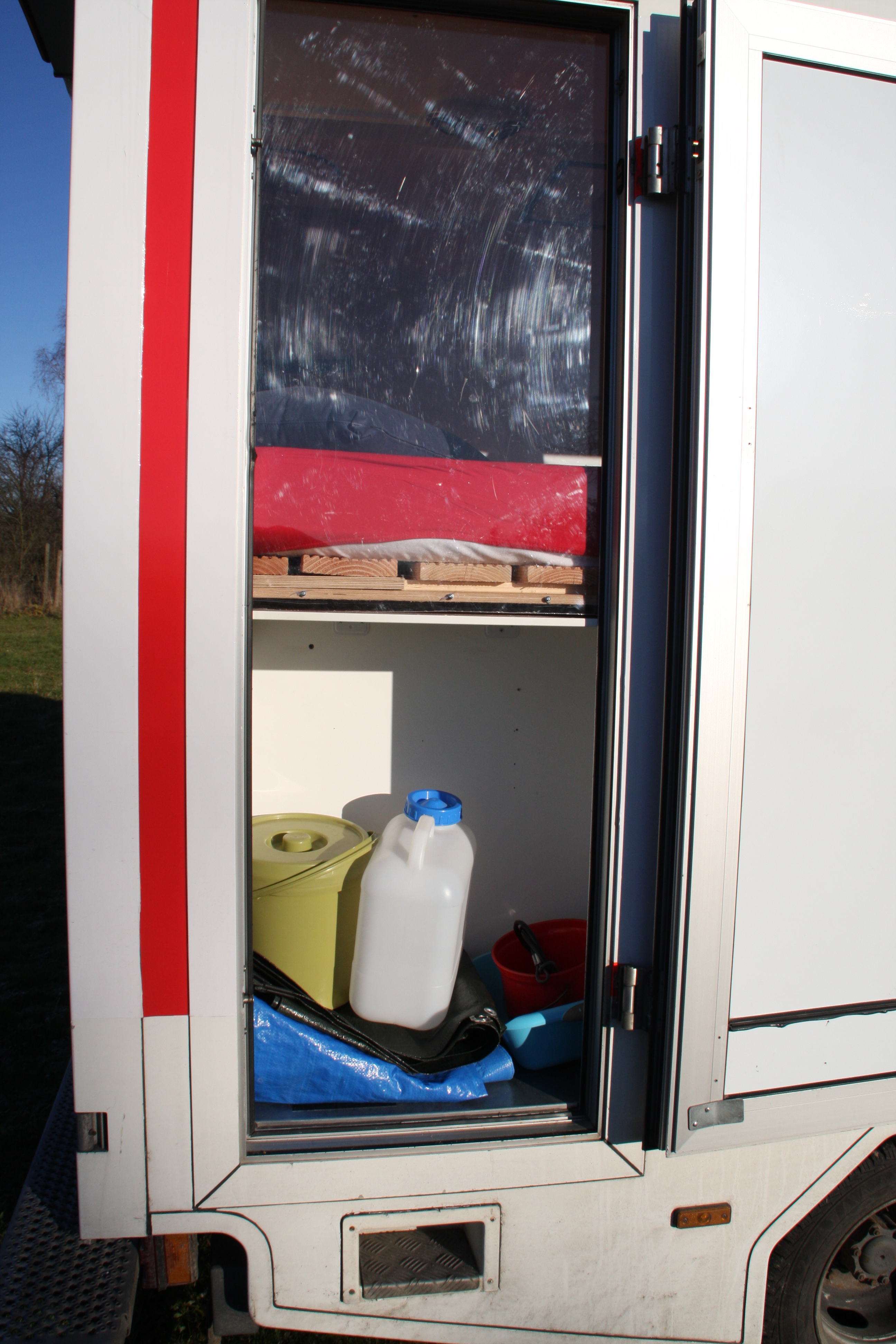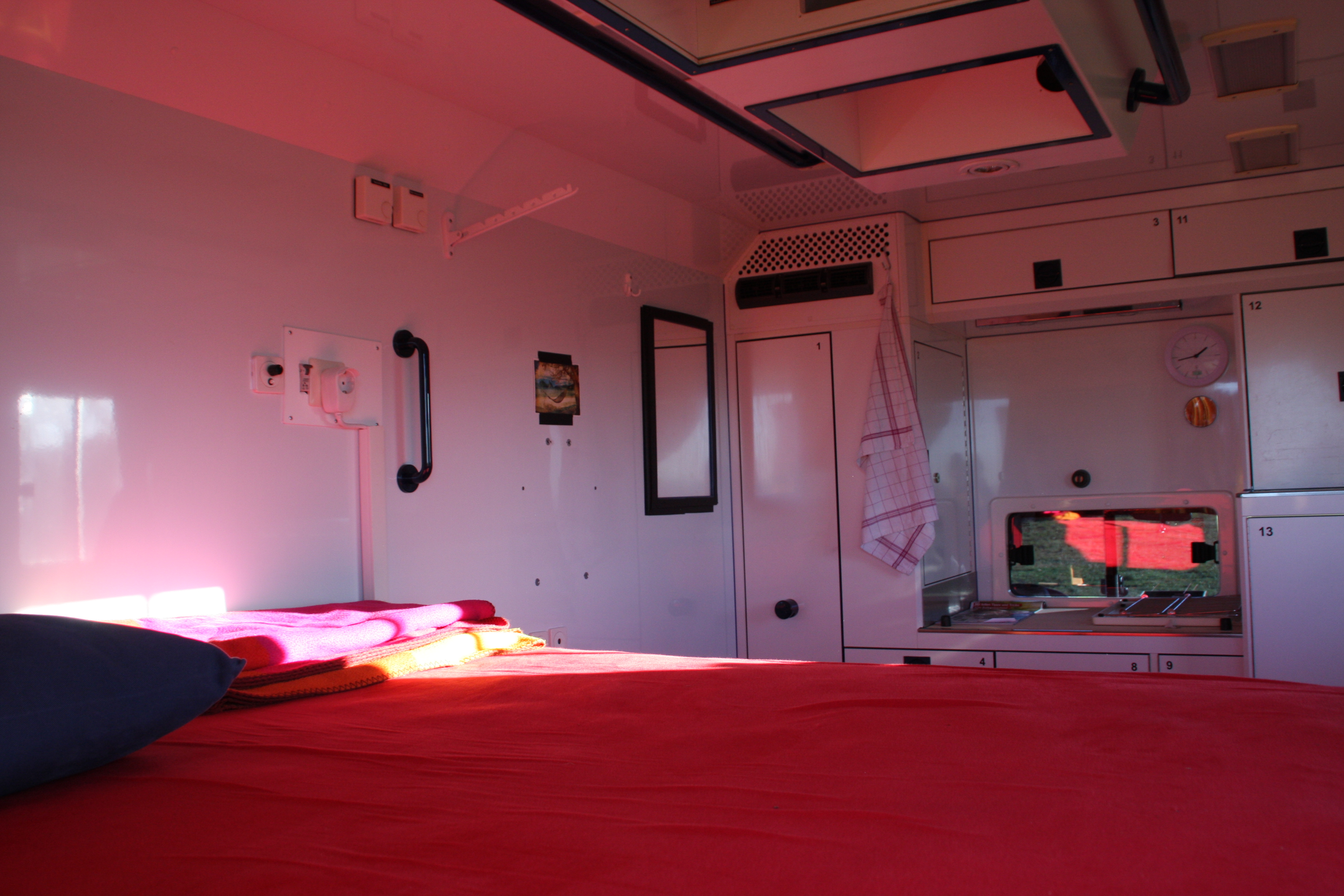Der geräumige Kastenaufbau des Vans bietet 6 qm Platz, ist zwei Meter hoch und breit sowie über drei Meter lang, was ihn zu einem richtigen Zimmer macht. Mit geöffneten Flügeltüren am Heck haben sie einen Balkon und können so immer die Aussicht genießen. Wenn Sie am Stehplatz einen 230V Zugang haben, können Sie mit dem integriertem 230V Anschluss am Auto einen elektrischen Heizer mit Thermostat nutzen, der dann schnell für angenehme Wärme sorgt.